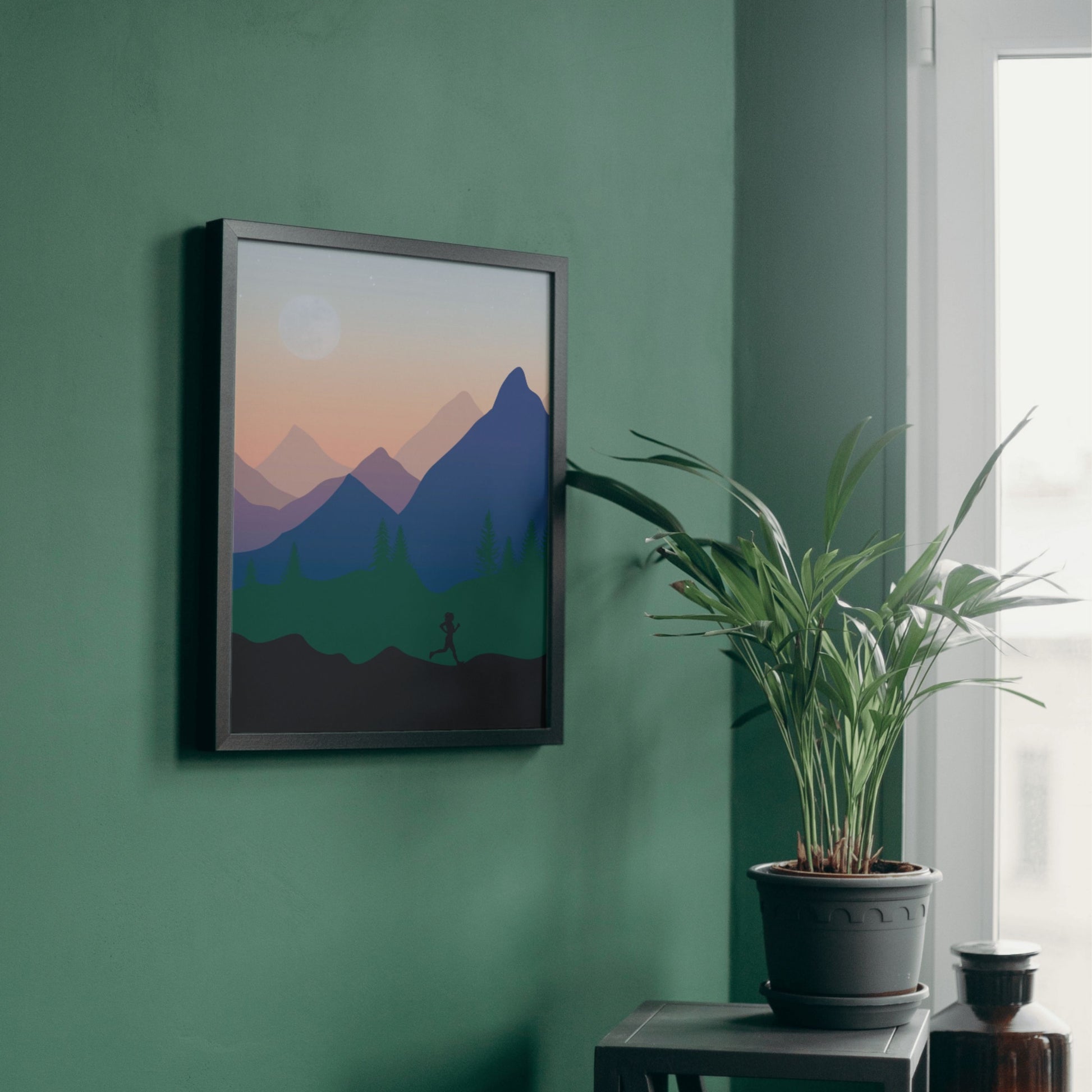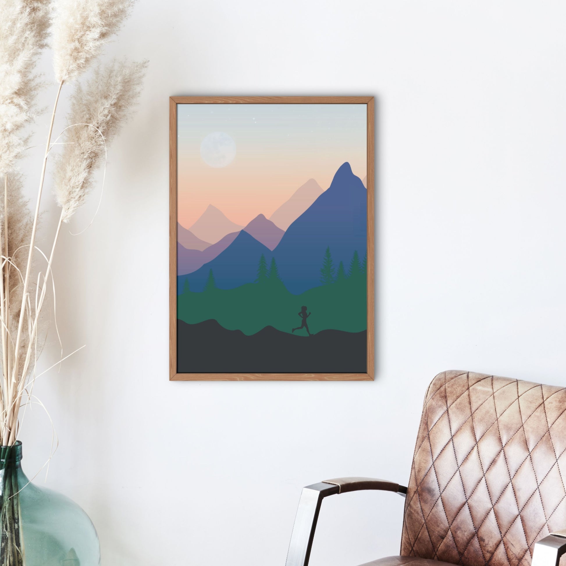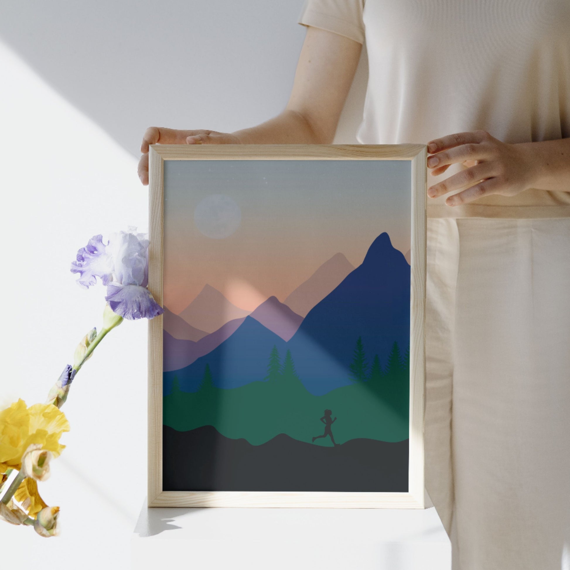 This calming landscape print blends soft dusk tones, layered mountains, and the silhouette of a lone runner — capturing that peaceful, meditative feeling found only on the trails.
